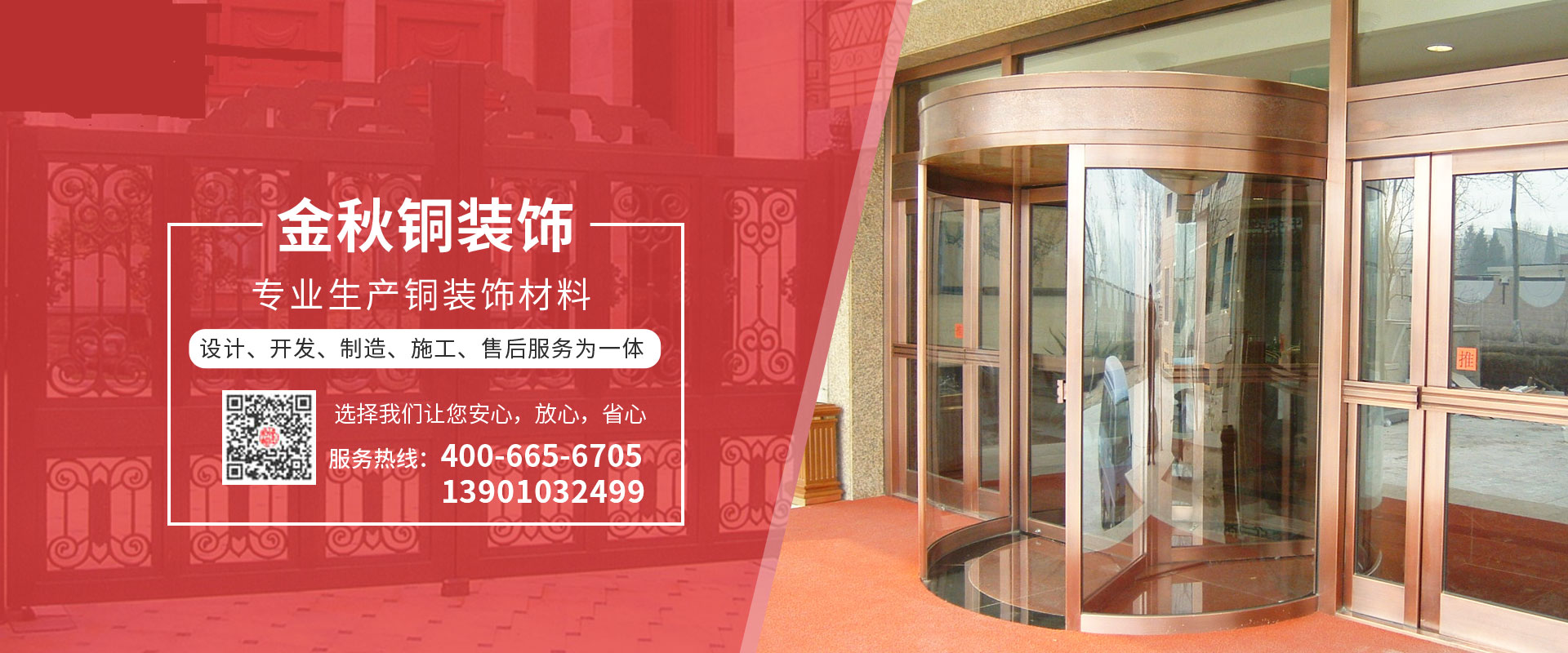 北京金秋銅裝飾材料有限公司是專業(yè)生產(chǎn)銅裝飾材料及設計、開發(fā)、制造、施工、售后服務為一體的大型綜合企業(yè)。可承接建筑銅裝飾工程及五星級酒店、別墅、博物館、樓樘管所等高檔銅裝飾項目;生產(chǎn)各種規(guī)格的旋轉門、平滑門、別墅門、電控門、工藝門、旋轉護欄、屋頂銅飾防水瓦、浮雕壁畫......